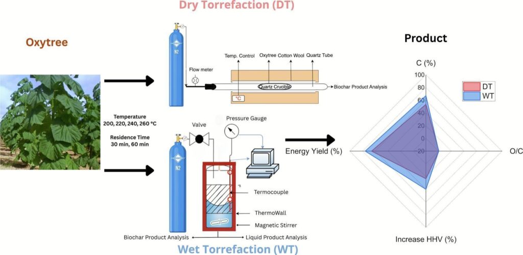 Hilal Unyay, Andrii Kostyniuk, Szymon Szufa, Artur Lewandowski, Blaž Likozar, Grzegorz Wielgosinski, Dry vs wet torrefaction of oxytree biomass: A comparative study on fuel properties and energy yield, Energy Conversion and Management, Volume 350, 2026, 120974, ISSN 0196-8904, https://doi.org/10.1016/j.enconman.2025.120974
